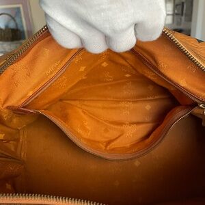Elegant MCM handbag with signature Visetos pattern. Features sturdy handles and gold-tone accents. Zippy zip closure, 1 internal pocket and 1 internal zippy pocket. There is hardware for an external strap (see images of side panels), but no strap is included.