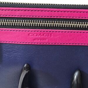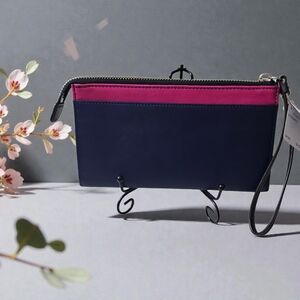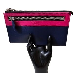 Elegant Coach wristlet with a vibrant pink top and deep navy bottom. Features a sleek zipper and wrist strap for convenience. In the interior there are 6 card slots and 2 currency pockets.NWT I will include a dust bag.