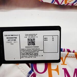 This striking Emporio Armani bikini showcases a vibrant logo print, blending hues of orange, purple, and pink. The halter top and adjustable side ties ensure a customized fit, while the premium materials offer comfort and durability. Ideal for lounging or swimming, this set combines luxury styling with practicality.