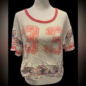 Stylish crop top with bold red number design. Features intricate patterns on sleeves and hem. Perfect for casual outings. Bought this hit was too small for me.