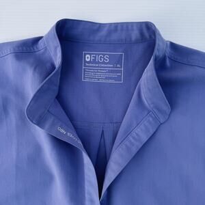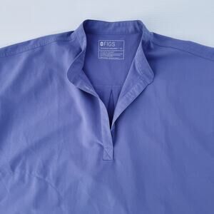 FIGS Rafaela Oversized Scrub Top in Blueberry (PO 4232), Women’s XL from the Technical Collection, featuring a modern boxy silhouette, cap sleeves, structured collar with partial placket, back pleat detail, side pocket with logo tab, wrinkle-resistant 72% polyester 21% rayon 7% spandex stretch fabric, lightweight breathable performance medical uniform top in very good pre-owned condition with light wash wear and minor wrinkling but no visible stains, holes, or structural flaws; machine wash cold, tumble dry low, do not bleach or dry clean. Blueberry has been retired, but is SUCH a cute color and if anyones comes across a women's small tall bottom, please let me know!