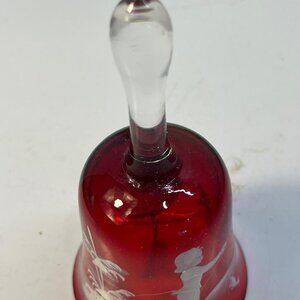 Vintage Red Crystal Glass Hand Bell White Etched Boy Fishing Scene 6 Inches