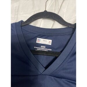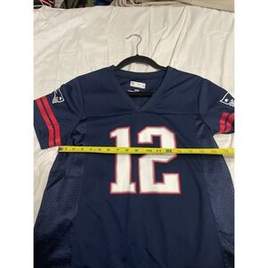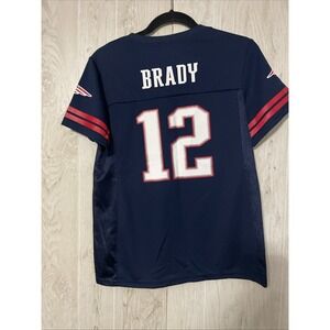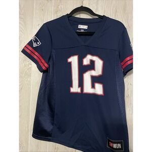 The product is a women's medium-sized New England Patriots jersey featuring Tom Brady's name and number. It is specifically designed for fans of the National Football League (NFL) team and player. The jersey is blue in color and is categorized under sports memorabilia and fan apparel for football fans. This authentic jersey is suitable for female fans looking to show their support for both the team and their favorite player on game days.