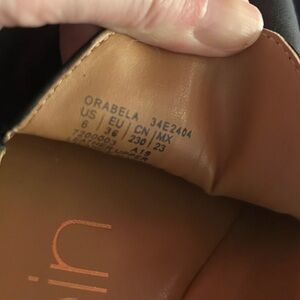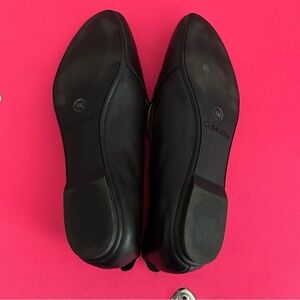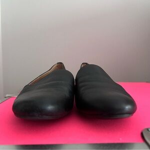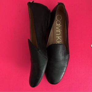 Sleek and stylish slip-on black flats by Calvin Klein with a round toe and a cushioned footbed. Leather upper and best fits a size 5.5 or 6. Great condition. Only worn maybe 2x.
