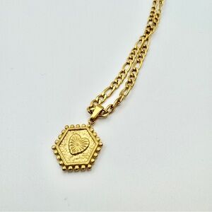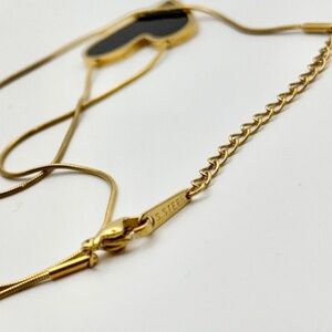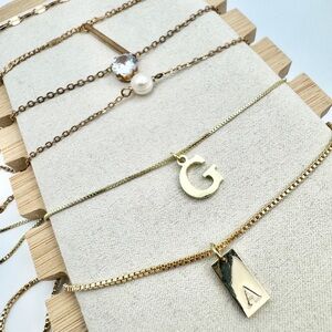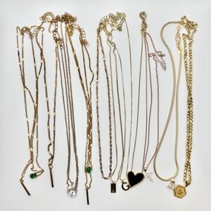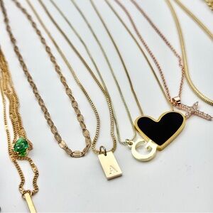 Elevate your style with this beautiful mix of gold and rose gold necklaces. This lot includes delicate chains and bold pendants like the black enamel heart, initials A, G, and N, a rose gold cross, and vibrant green stones. A perfect blend of minimalist and statement pieces for easy layering. Size Information • Assorted lengths • All include adjustable extenders Condition • Great pre loved quality • Mix of S925 sterling silver and hypoallergenic plated metal Gold jewelry lot, S925, Sterling silver, Rose gold, Initial necklace, Heart pendant, Cross necklace, Layering set, Dainty jewelry, Hypoallergenic, Snake chain, Figaro chain, Minimalist, Jewelry bundle, Trendy accessories