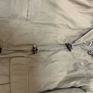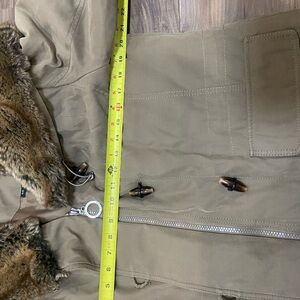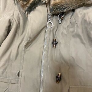 Stay warm and stylish with this elegant tan puffer coat featuring luxurious fur trim. Perfect for chilly days.