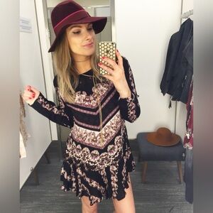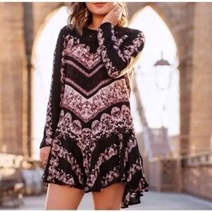 Effortlessly boho and feminine Free People tunic featuring a stunning mixed floral and border print in black, mauve, blush, and cream tones.