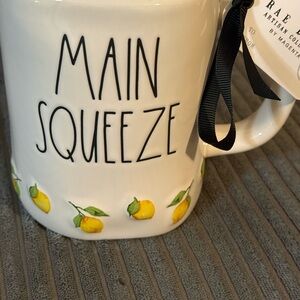 This Rae Dunn White Mug with Lemon Pattern, featuring the phrase "MAIN SQUEEZE," is a stylish and decorative piece for any occasion. Made of ceramic with a multicolor lemon design, this round mug has a 16-18 oz capacity and is machine washable for easy care.