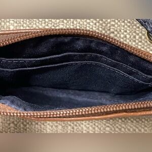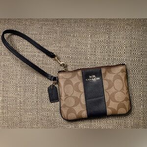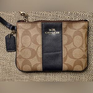 Stylish Coach wristlet in brown and black. Features signature logo design. This wristlet is preowned and in great condition! Please check out the pictures for more details. Signature coated canvas and crossgrain leather