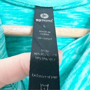 90 Degree womens turquoise marled activewear hoodie. Features a drawstring hood, kangaroo pocket, and thumbholes in the sleeves. The hemline is curved and slightly longer in the back. Raglan sleeves provide a comfortable fit. Size L. Style: 144527. 90% Polyester, 10% Spandex. Made in China.