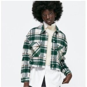 Zara Women Green Plaid Cropped Jacket Shacket Sz M Button Up Cozy Wool Blend