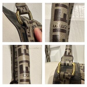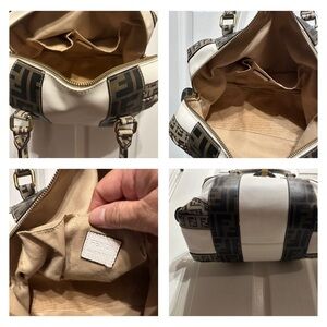 Vintage Fendi Zucca Zucchino Spalmati B Mix Boston Bag, which features a combination of white and brown FF monogram canvas. Normal wear and tear. Carefully check all photos before buying. I am not sure of its authencity as it was just gifted to me. Rare design. DIfficult to find it available anywhere else. No return. Firm on price. Ships next day.