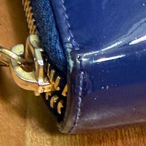 This wallet is in excellent used condition with very light signs of gentle use. The patent leather remains glossy. There are pictures of wear on the bottom corners. The interior is extremely clean and the zipper runs smoothly. The inside zipper pull looks like it has some wear. Please refer to all photos for a detailed view of the item.