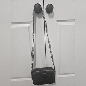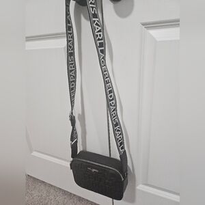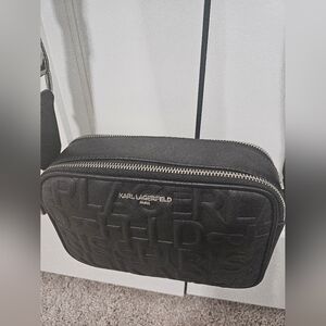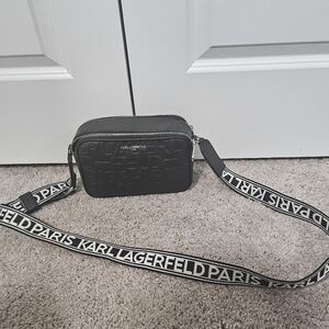 Karl Lagerfeld Paris Maybelle Camera Crossbody bag, featuring an Embossed logo pattern and a branded webbing strap. New w/o Tag. Excellent condition and no imperfections. Add this cute and stylish bag to your collection!