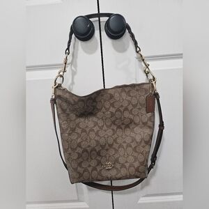 • Interior slip pocket & 3 card slots • Small sized bag; 9"W x 6"H x 3"D (width is measured across the bottom of handbag)• 23"L adjustable webbing strap• Double zip closure • Silver-tone hardware.