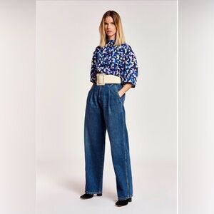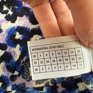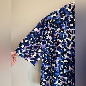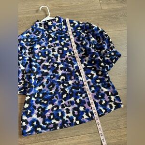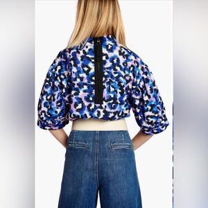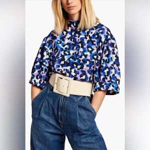 ESSENTIEL ANTWERP Leopard Print Puff Sleeve Top Stylish leopard print top featuring vibrant blue and purple colors. Perfect for a bold fashion statement. Mock neck. Short sleeve. Purchased at Nordstrom. Brand size 34 equals a US 2 as shown on tag.