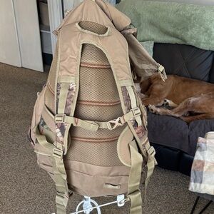 Durable camo backpack perfect for outdoor adventures. Features a rugged design with ample storage space.