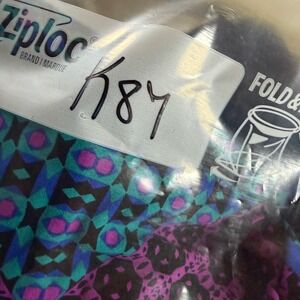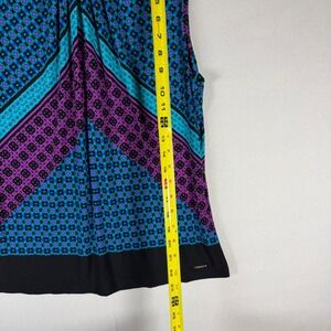Calvin Klein sleeveless blouse showcases a vibrant geometric print in shades of teal, purple, and black. This shell top features a sophisticated pleated neckline and a keyhole back with a button closure for a polished look. The lightweight, stretchy fabric ensures a comfortable fit, while the solid black border at the hem adds a modern touch. Perfect for layering under a blazer for the office or wearing on its own for a stylish evening out.