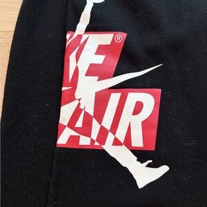 Classic boys Nike Air Jordan sweatpants in black with bold red and white Jumpman/Nike Air logo on the leg. Soft fleece interior, elastic waistband, and ribbed cuffs for a comfortable jogger fit. Perfect for school, sports, lounging, or everyday wear.