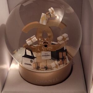 Elegant Chanel snow globe featuring gold accents and gift boxes. Perfect for collectors.