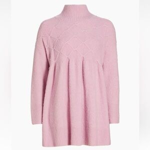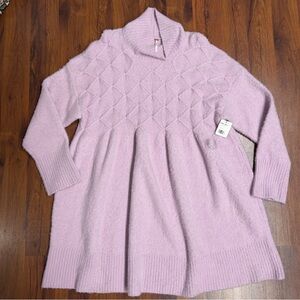 Cozy knit dress with a high neckline. Features a textured diamond pattern. Long sleeves for added warmth.