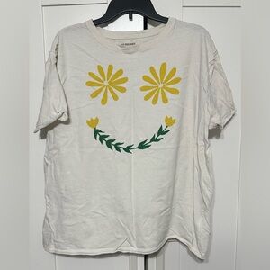 We The Free flower graphic tee. This is a size XS, but it is oversized. This is also cropped. There is a small hole on back right shoulder. This shirt is off white.