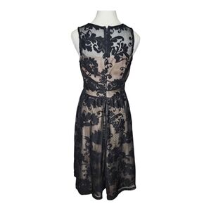 Fit and flare black lace dress with beige lining underneath is perfect for any special occasion. The intricate lace design adds a touch of sophistication and style. Ideal for evening events or formal gatherings.