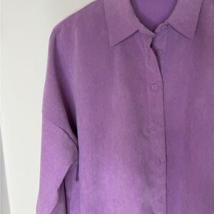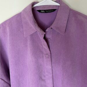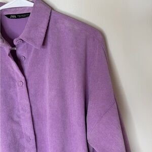 Zara purple corduroy button-front shirt with a relaxed, oversized fit. This versatile piece works perfectly as a lightweight shirt jacket (shacket) or an easy layering top. Soft corduroy texture with a structured collar, long sleeves with cuffs, and full button closure down the front. The rich lavender / dusty purple color makes it ideal for fall, winter, and transitional seasons.
