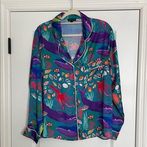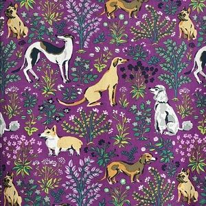 Vibrant purple cotton fabric with a botanical and dog print. Features intricate leaf patterns. Size large. Sleeve are mid length, not short not long. Worn and washed a few times, still in amazing condition! No holes/tears. Price negotiable, thanks!