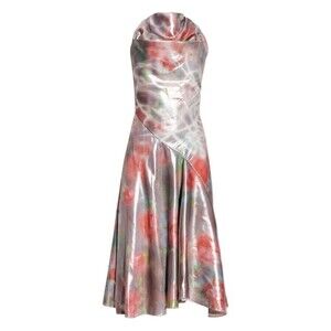 Crafted by Diesel, this captivating midi dress showcases a vibrant pink floral print enhanced by a lustrous sheen. The design features a stylish halterneck, an alluring open back, and intricate criss-cross straps, flowing gracefully into a flared skirt. A discreet metal logo plaque adds a touch of refinement, making this piece a statement of elegance and charm for any occasion.