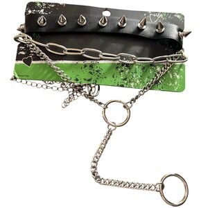 Edgy layered choker necklace set featuring a faux leather spike choker and layered chain necklace with O-ring drop detail. Nickel-free metal. New on original card. Adjustable length. Perfect punk, goth, grunge, or alt fashion accessory.
