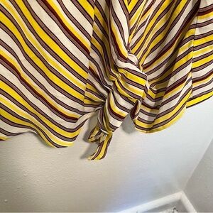 Great condition. Timing. Faux wrap blouse. Sheer. Yellow with white, black and red stripes. Long sleeve. Tie detail at hem. Style TM3246X. Plus size 3X. 100% polyester. Pit to pit laying flat 25” Shoulder to hem 26” Sleeve (pit to hem) 17.5”. All measurements are approximate and taken laying flat. Smoke free home. No trades, offers welcome.