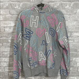 Comfortable gray hoodie with colorful letters. Ideal for casual wear.
