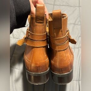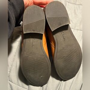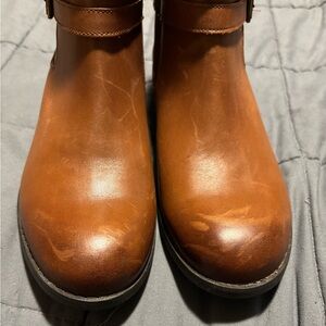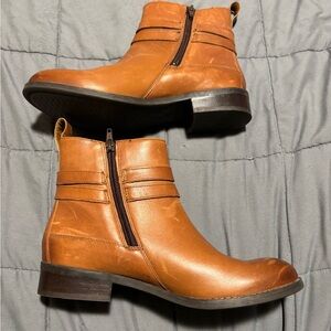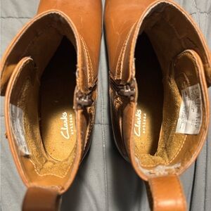 CLARKS Pita Austin tan leather boots. In GREAT condition, sole has some slight scuffing from wear and there are some scratches in the leather that are pictured. Also pictured is some wear on the inside back part of the left boot. Zipper closure and women’s size 8. Plenty of life left and ready for a new home!