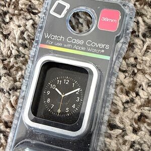 Set of two Apple watch case covers. Sleek black design with silver accents. Compatible with 38mm Apple Watch Series 1, 2, 3.