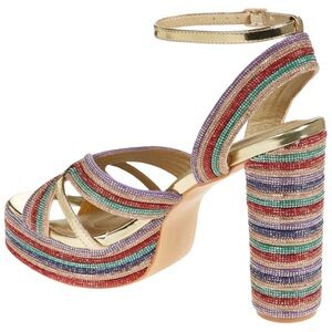 Colorful layers of rhinestones stack and shimmer, emboldening this statement-making platform sandal designed to be seen. The Kinslee features vibrant rainbow striping over a chunky heel and platform, balanced with sleek gold metallic accents for a luxe finish.