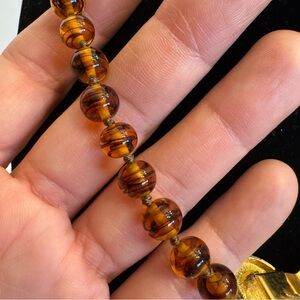 Faux Tortoise Shell Amber Vintage Glass Beaded Necklace Large Box Cabochon Clasp