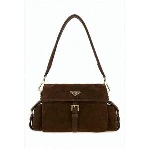 This shoulder bag from Prada is made from soft lambskin, featuring a rich brown suede finish. The structured rectangular shape includes a flap closure with a stylish buckle strap and a single padded shoulder strap. Gold-tone hardware, highlighted by a unique triangular logo plaque on the flap, adds a touch of sophistication. Side pockets provide practical storage, making it suitable for both casual and upscale events.