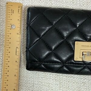Elegant and stylish, this Michael Kors wallet features a classic quilted design. Crafted in black leather, it's perfect for any occasion. Some tarnish on the gold clasp, but no other callouts.