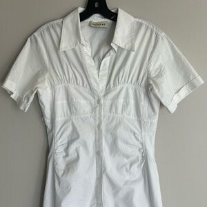 * Style: The Tenley Midi Dress. A white, short-sleeve shirt dress with a button-down front, collar, and side pockets. It features a fitted bodice with corset-style seaming and ruching.