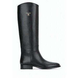 Celine offers a pair of boots that captures minimalist elegance. Made in Italy from high-quality smooth calf leather, the design showcases a slender, tall silhouette with a slightly pointed toe and a low, flat heel. Subtle stitching and a discreet embossed logo enhance its refined look, making these boots a versatile addition to any wardrobe.