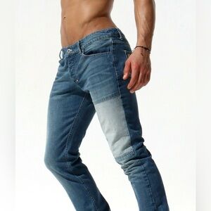 Designer Features: Rufskin logo patch on back left pocket; contrast patch left leg; logo embossed on rivets and buttons Size and Fit: Slim fit through the entire leg
