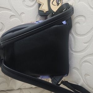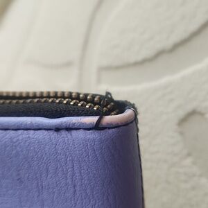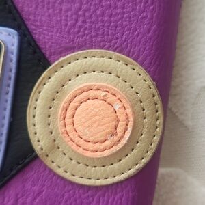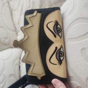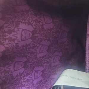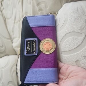 Evil Queen themed mini bag set by Loungefly. Features bold black and purple design. Gold crown accents. Includes matching wallet. little bit of the color coming off the wallet on the corners and little bit if thread sticking out