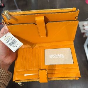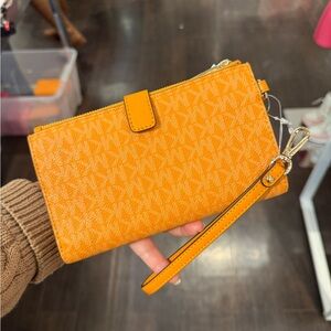 Chic Michael Kors clutch with wristlet strap. Eye-catching orange design. Ideal for essentials.