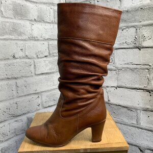 Vintage 70s Slouch Boots 38 US 7.5 Cognac Leather Retro Boho Knee High Mid Heel