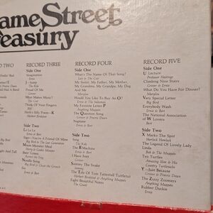 Vintage Sesame Street Treasury vinyl boxed set of 5, great nostalgia piece! Cover is in good condition with slight water mark on the corner. Includes all 5 double sided records (had to remove them before pulling the inner sleeve out for a picture because they're heavy 😅) Open to offers. Untested as my record player recently broke 😔
