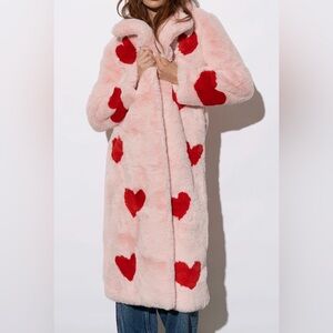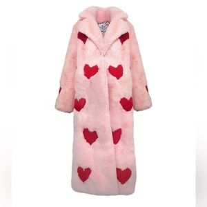 Stay cozy and stylish with this pink coat featuring a charming red heart pattern. Perfect for adding a playful touch to your winter wardrobe.