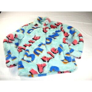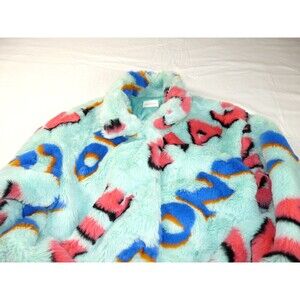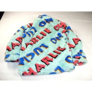 Charlie Luciano Milano Rare Limited Teal Blue Red Fuzzy Logo / Name Allover Print Snap Up Jacket - FLAWED - See Photos / Condition Description - MSRP $600+
