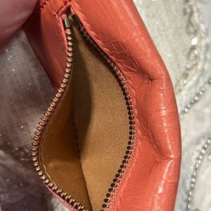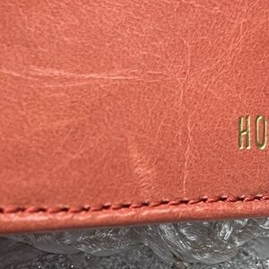 Awesome corral colored, crinkled leather card case. Bi-fold with Hobo logo on the front and zippered pocket on the back. Will hold 4 CC’s. Does have a couple rub marks, not super noticeable. See pics