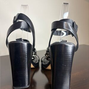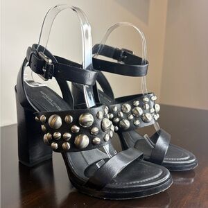 • Style: Black leather strappy sandals with oversized silver-tone dome studs and a bold block heel